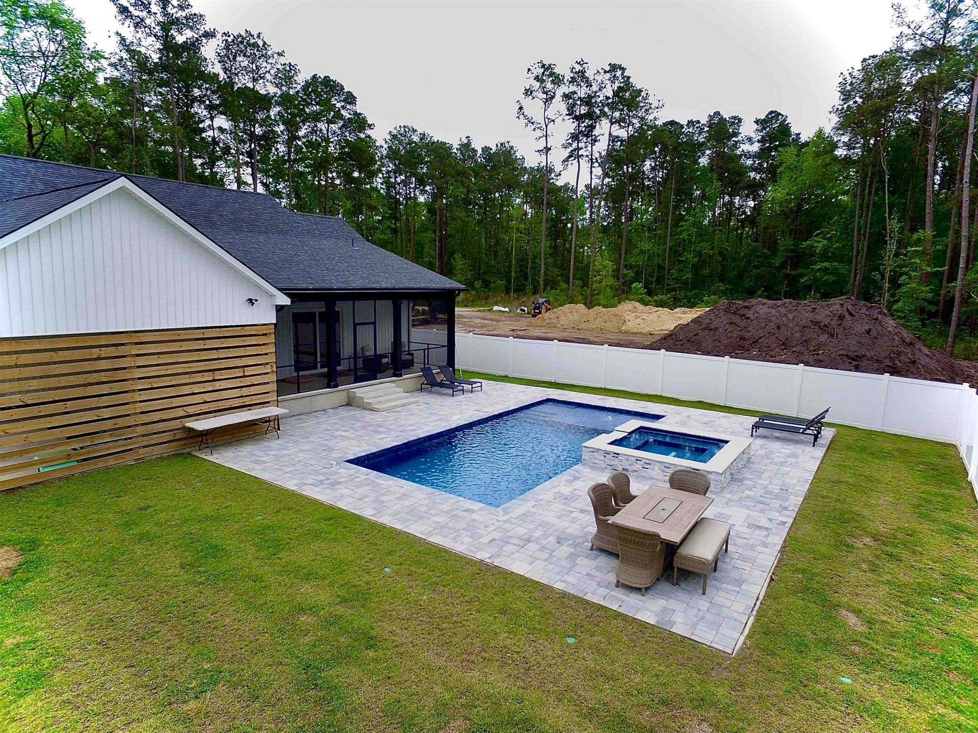 Enjoy the summer with your new home and custom pool! NO HOA! Room to park your boat or RV! Large front and rear screened in porch overlooking beautiful custom pool and hot tub and private backyard with view of wetlands. Upgrades throughout! Beautiful double front door leads to open floor plan with upgraded chefs kitchen featuring upgraded gas range, breakfast bar, in counter microwave, stainless steel range hood, custom backsplash and upgraded cabinetry. Large master bedroom and luxury en suite with large tiled walk in shower with stand alone garden tub. Guest bath features tub/shower with tiled surround. Laundry room features custom cabintry and laundry sink including drop zone area. Gas HWH. Live on a quiet road yet close to all that the Grand Strand has to offer. All measurements and square footage estimated. Buyer and/or buyers agent responsible for verification. Must see and Easy to see!